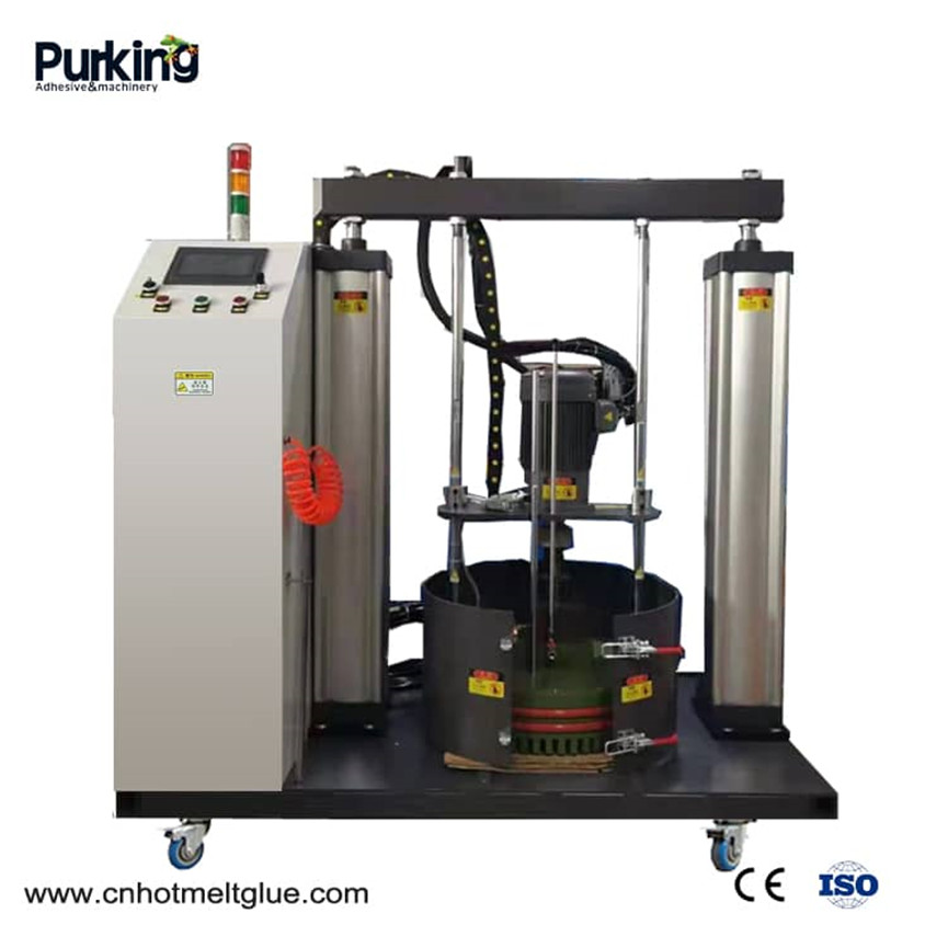 Mūsu 55 gal PUR beztaras kausēšanas iekārta pakāpeniski silda un kausē: sildīšanas plāksne atrodas virs līmes. Kad karsēšanas plāksne tiek uzkarsēta, tikai līmes mucas augšējais slānis saskaras ar sildīšanas plāksni un sasniedz kušanas temperatūru un kūst. Theglue mucas apakšējā daļa šajā laikā nekūst. Lai izpildītu mūsu prasību pēc kausēšanas, cik vien mums nepieciešams ražošanā, gumijas mucā esošajai līmei ir ilgs kalpošanas laiks: kalpošanas laiks var būt līdz 16 stundām 150 ° C temperatūrā un 3 dienām 90 ° C temperatūrā. Vairāk nekā gadu klienti ir labi novērtējuši uzņēmuma produktus.