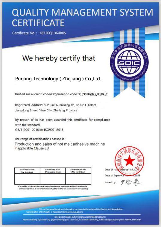 Purking Technology (Zhejiang) Co, SIAtika izveidota 2014. gadā. Tas ir profesionāls karstā kausējuma adhezīvu mašīnu uzņēmums, kas integrē pētniecību, attīstību, mārketingu, personāla apmācību un pēcpārdošanas servisu. Uzņēmumam ir vairāk nekā 1000 rūpnīcas ēku kvadrātmetri. Uzņēmuma tirdzniecības galvenā mītne atrodas Yiwu City, Zhejiang provincē. Ražošanas un montāžas centrs atrodas Dongguan pilsētā, Guandunas provincē. |